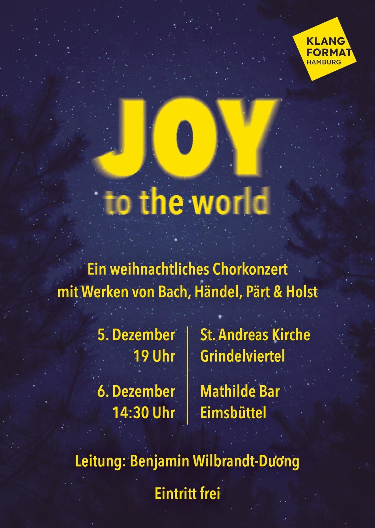 Freitag, 05. Dezember 19 Uhr – „Joy to the world“, ein weihnachtliches Chorkonzert mit Werken von Bach, Händel, Pärt und Holst.