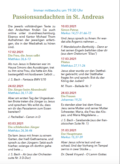 Aber am ersten Tag der Ungesäuerten Brote traten die Jünger zu Jesus und sprachen: Wo willst du, dass wir dir das Passalamm zum Essen bereiten? Er sprach: Geht hin in die Stadt zu einem und sprecht zu ihm: Der Meister lässt dir sagen: Meine Zeit ist nahe; ich will bei dir das Passamahl halten mit meinen Jüngern.